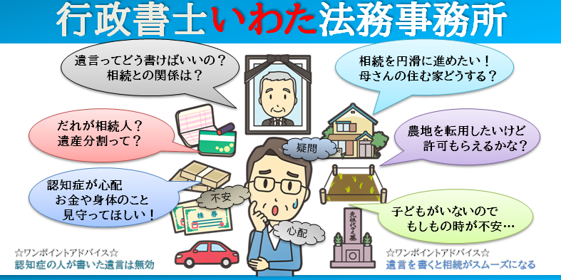 遺言・相続・後見人・農地転用 等 少子高齢化がもたらす不安や心配に寄り添いサポートします!! |
